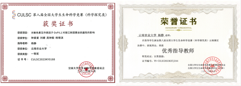 本次竞赛中,杨静老师指导的钟爰爰团队紧扣国家粮食安全重大需求,从水稻抗病育种中面临的抗性与产量权衡的难题出发,以课题组前期挖掘到的光敏色素互作类因子基因OsPIL1为研究对象,以高感粳稻丽江新团黑谷为背景,获得OsPIL1转基因水稻,从生理和分子角度解析OsPIL1对水稻稻瘟病抗性的影响,为光敏色素互作类因子OsPILs促进粳稻抗瘟性的作用提供了新的见解,展示了其可能成为减缓抗性—产量权衡的潜在育种“工具”,助力水稻基因编辑抗病育种。