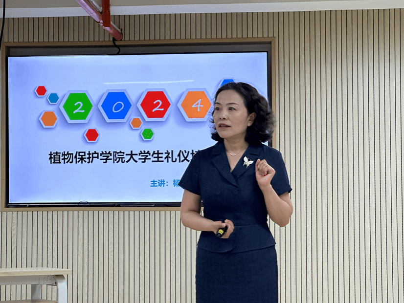 副教授、高级礼仪指导师杨红凌为学员进行大学生礼仪培训专题讲座。