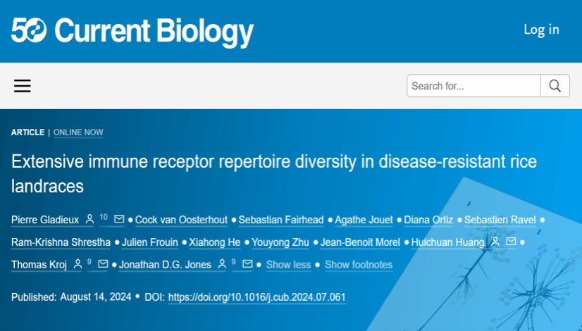 2024年8月14日,黄惠川教授团队联合英国东英吉利大学塞恩斯伯里实验室Jonathan Jones院士和法国农业食品环境研究院蒙彼利埃植物健康研究所Thomas Kroj研究员团队在国际权威期刊Current Biology(中科院1区TOP,IF5 year=9.8)上联合发表了题为“Extensive immune receptor repertoire diversity in disease-resistant rice landraces”的研究论文,揭示了云南元阳梯田水稻地方品种长期保持抗病能力的关键机制。