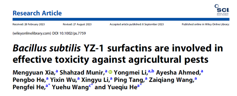 昆明植物研究所王跃虎副研究员团队在国际知名期刊《Pest Management Science》(Top1,IF = 4.462)上发表题为“Bacillus subtilis YZ-1 surfactins are involved in effective toxicity against agricultural pests”的研究论文,该文章揭示了枯草芽孢杆菌YZ-1杀虫活性成分是表面活性素类化合物,YZ-1高效杀虫的原因是该菌株合成表面活性素的能力很强。