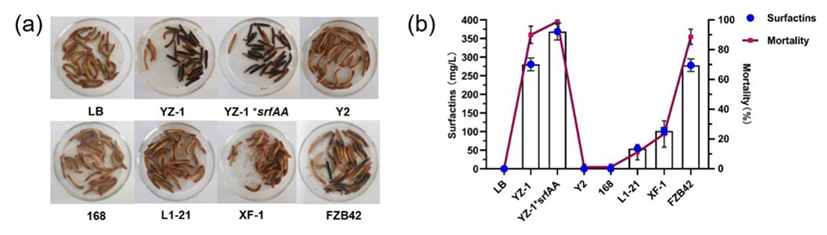 图 6 不同芽孢杆菌的杀虫活性。(a)几株芽孢杆菌发酵上清液处理后的黄粉虫;(b)黄粉虫的死亡率与几株芽孢杆菌表面活性素的产量。