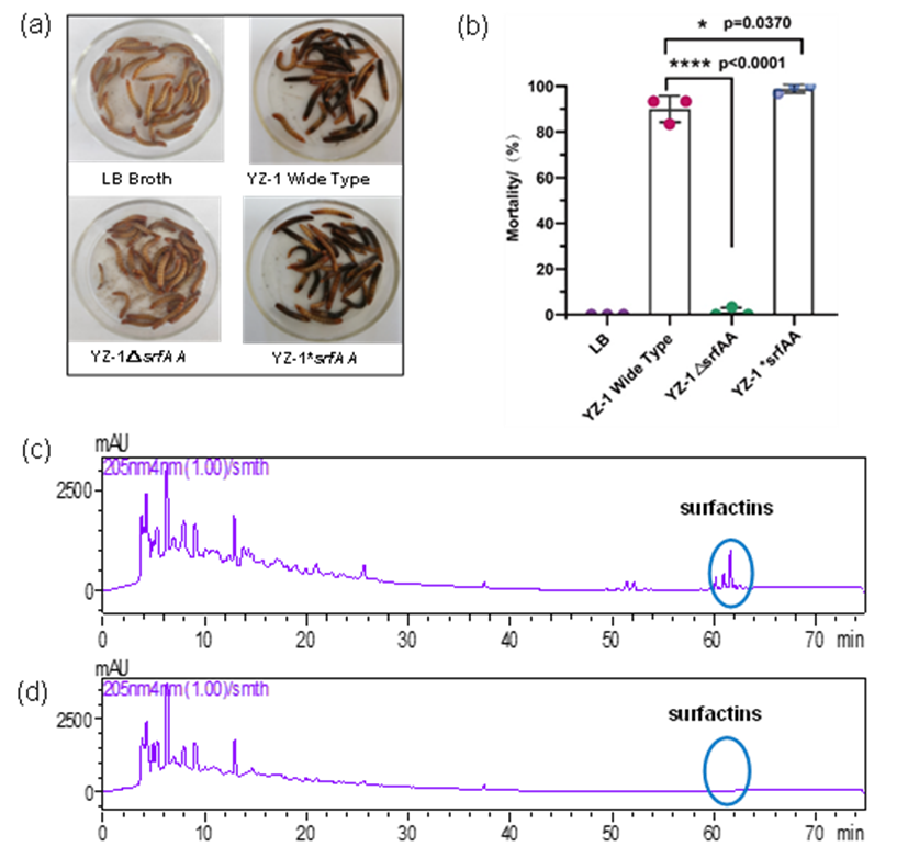 图5 枯草芽孢杆菌YZ-1产表面活性素的杀虫活性验证。(a,b)突变体的杀虫活性;(c)YZ-1野生型次生代谢产物总离子流程图;(d)突变体YZ-1
