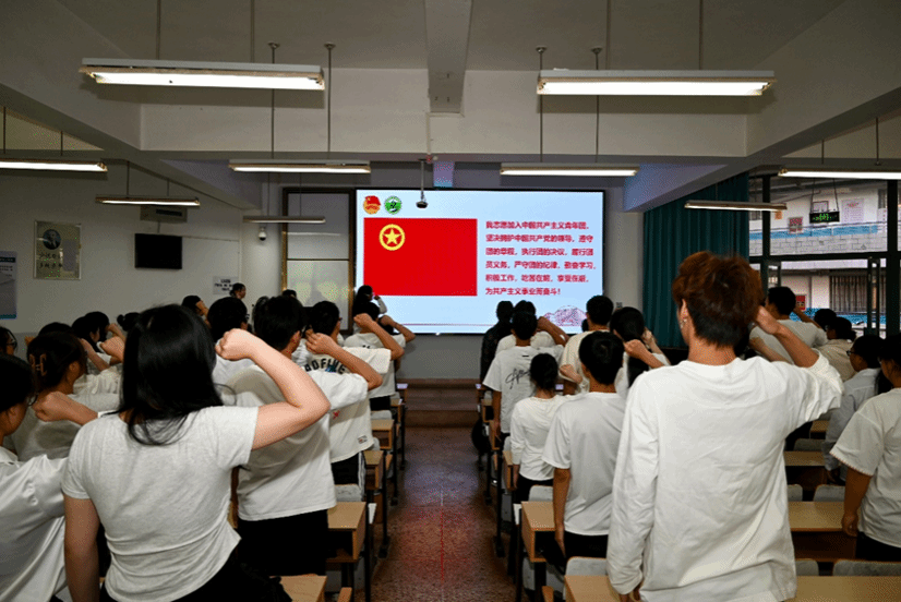 随后举行新团员入团仪式。全体团员重温入团仪式,新团员代表张雅琪表达了入团感受,阐述了未来的行动目标。随后,老团员为新团员佩戴团徽,象征红色基因的传承。