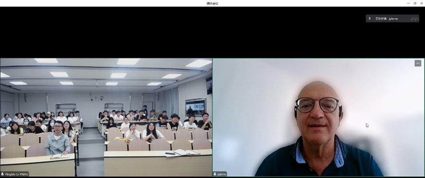 在互动环节中,Jean-Pierre Vors教授首先鼓励同学们不要含羞,积极互动。同学们就讲授过程中提出的问题积极思考,并分别从农药残留、天然产物毒性以及转基因作物等方面进行互动讨论。学生们表示对这样的课程教学模式非常激动,希望今后能有更多的机会参与这样的课程学习。部分同学也表示,课程中最大的难度在于专业英语词汇及听力方面,尽管在授课过程中存在听不懂的句子,但至少能理解一些关键词。2名21级的同学还分别用法文、英文与Jean-Pierre Vors教授打招呼,并就未来赴法深造学习等问题进行了咨询。