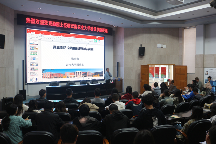 20231022日,太阳城娱乐城 张克勤院士走进永利(澳门)娱乐场官网 教学课程系列活动,为永利娱乐场 本科生讲授了一堂精彩的《微生物防控线虫的理论与实践》课。张院士图文并茂地讲授了微生物与线虫之间捕食与被捕食的博弈理论,和如何将理论成果运用于农业生产实践中。他着重为学生讲述了如何提出科学问题和假说,如何设计实验论证,启迪学生要勇于质疑,才能培养创新思维。习近平总书记寄语青年人要“志不求易者成,事不避难者进”,张院士结合自己成长的经历阐释了这一寄语,教导学生一定要树立人生的奋斗目标,不空想和空谈,付出持续不断的艰苦努力,勇攀高峰,以达到设定的目标。同时还要学会与人相处、合作共赢。在师生互动环节,学生积极提问,张院士对提问进行了耐心的回答。