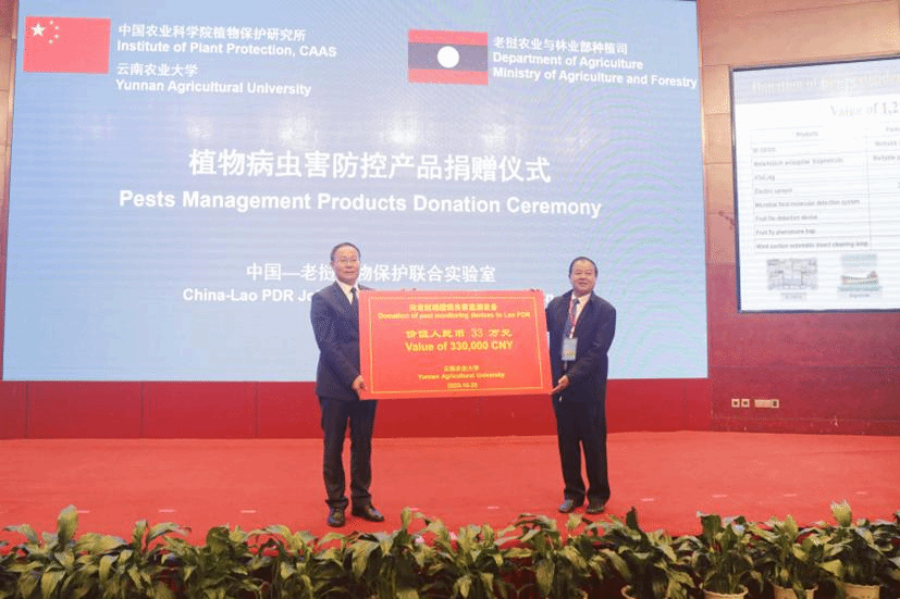 会议还进行了中国-老挝植物保护联合实验室活动,中国农科院植保所和云南农业大学分别向老挝农林部捐赠价值88万和33万的草地贪夜蛾防控产品和监测设备,帮助老挝共同应对草地贪夜蛾带来的威胁。中老两国是山水相连的友好邻邦,近年来中老两国在跨境病虫害防控合作中取得积极成效。